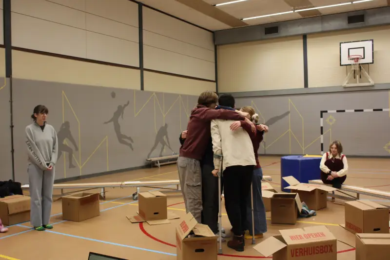 Om een zwaar onderwerp licht te maken, besloten we meta te gaan werken. Dat betekent: een stuk in een stuk. Hier leren de spelers meer over het zijn van een acteur in de ruimte, op de vloer, met elkaar.